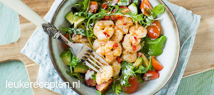 Deze salade met garnalen gebakken in rode peper en knoflook staat binnen 15 min op tafel