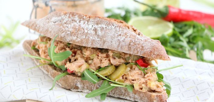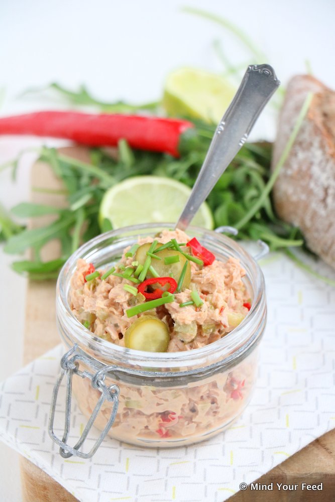 Een klein feestje op je boterham. Of op een toastje. Of op een wrap. Je mag helemaal zelf kiezen. Deze pittige tonijnsalade is te lekker om niet met je te delen. Zelf husselde ik alle ingrediënten eigenlijk bij toeval door elkaar want ik zocht iets om mijn broodje mee te beleggen. Het was zo’n dag… zo’n dag waarop ik 10 petten tegelijkertijd op had en de hele dag door liep te rennen en vliegen. En normaal snap ik nooit hoe mensen dat doen, maar ik kwam ergens rond half 3 in de middag tot de ontdekking dat ik nog niet had geluncht…. Echt niks voor mij!