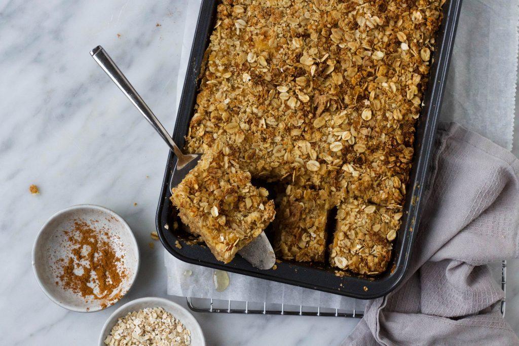 Zo vaak zag ik (én gegeten) van die mooie plaatkoeken in koffietentjes, bakkertjes en op Instagram. Ze zijn heerlijk! Een basis van smeuïge koek, een laagje fruit en een krokante crumble laag. Vooral de gouden combinatie van appel en haver. Tijd om zelf thuis eens zo een lekkere koek uit de oven te maken.