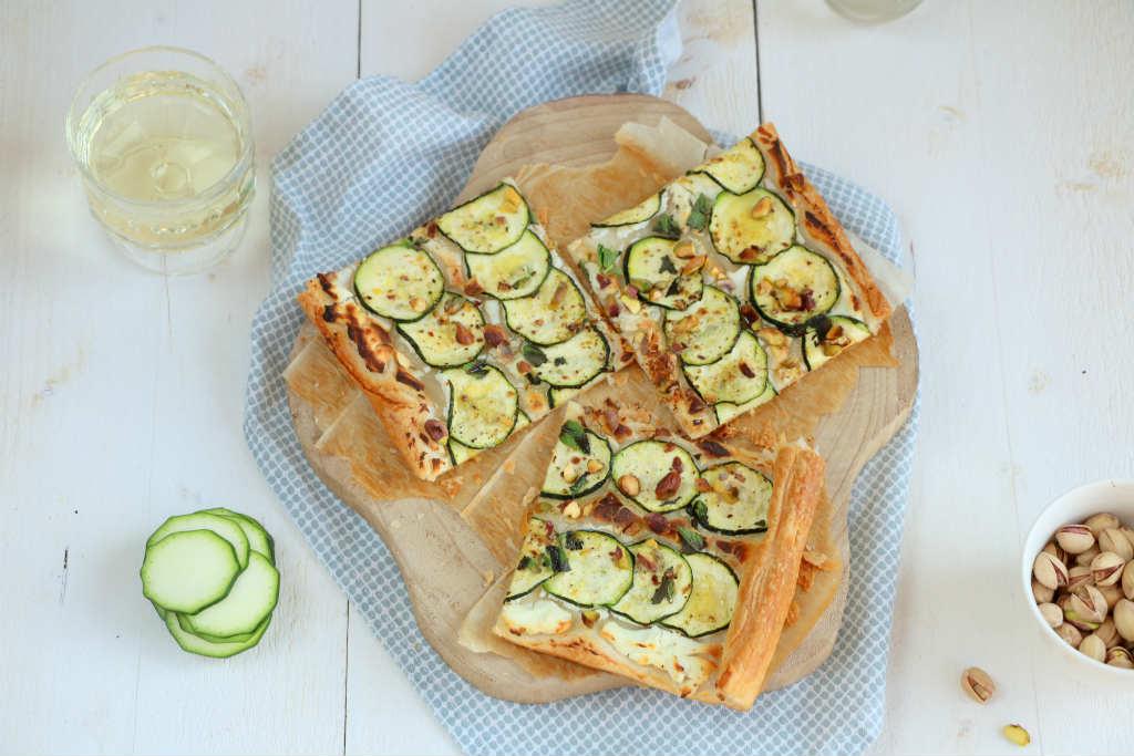 Zo stond ik vorige week woensdag na alle sportactiviteiten de plaattaart met courgette nogmaals in elkaar te draaien. De combinatie met geitenkaas, munt en pistachenootjes erbij is werkelijk geweldig. En ja, wanneer eet je nu de plaattaart? Ik vind een taart van bladerdeeg altijd iets feestelijks hebben. Bij een uitgebreide brunch zou deze niet misstaan, dus altijd een leuk idee voor Pasen. Snijd er dan kleinere stukken van, zodat iedereen een hapje kan proeven. Of serveer het als voorgerecht bij een dinertje. Of gewoon als avondeten op een vrijdagavond bijvoorbeeld met een extra salade erbij.