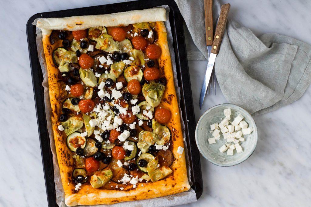 De knapperige bodem van de plaattaart in combinatie van gegrilde groenten, rode pesto en olijven is heerlijk! Een lekker en makkelijk comfort gerecht dat binnen een half uurtje gemaakt is.