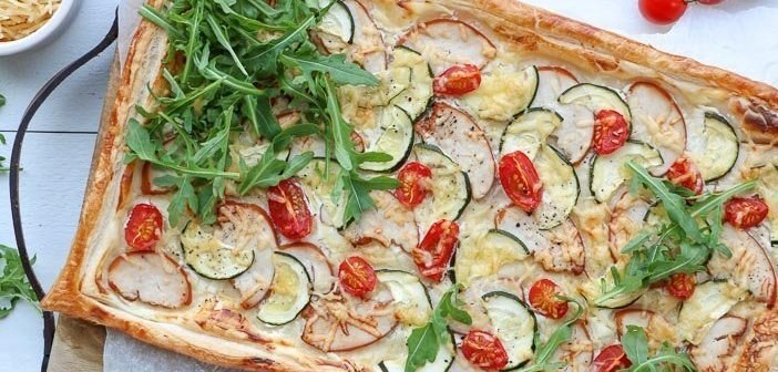 Plaattaart met gerookte kipfilet en courgette