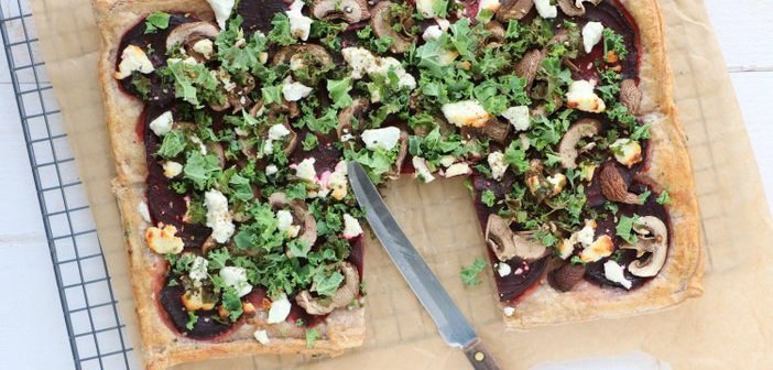 En daarom heb ik dus altijd bladerdeeg in de vriezer liggen. Want een plaattaart is dan zo gemaakt! Ik heb wat restjes uit de koelkast verzameld, waarvan ik het vermoeden had dat ze wel lekker zouden matchen, en dat is ook bij mijn soms een pure gok. Maar rode biet in combinatie met geitenkaas is áltijd goed, en nog wat extra groenten op de taart is alleen maar beter! Deze plaattaart met rode biet schuif je binnen 10 minuten de oven in, en dat is zeker voor drukke doordeweekse dagen wel erg fijn!