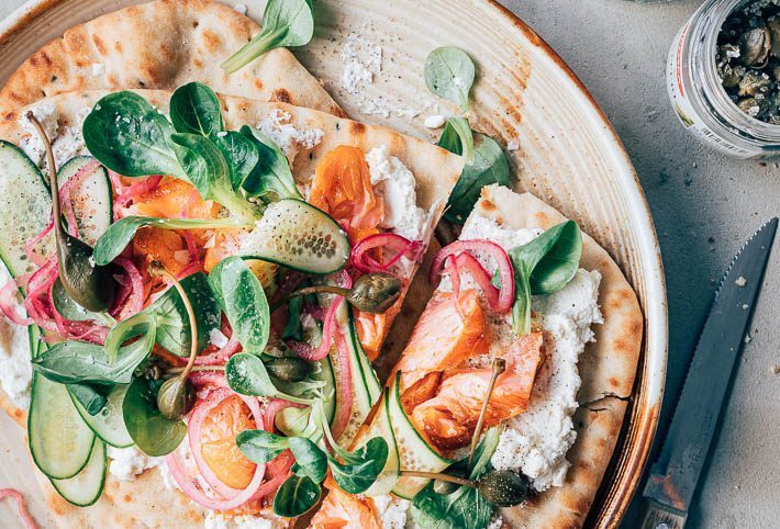 Ik ben helemaal gek op zalm. Rauwe zalm in dunne plakjes, perfect gebakken zalm dat hij mooi in vlokken uit elkaar valt, de rokerige smaak van gerookte zalm, maar mijn echte favoriet is warmgerookte zalm. Fantastisch! Bij warmgerookte zalm is de vis als het ware gebakken in de rookoven en met zout en de rook geconserveerd. De warmte zorgt ook voor een soort korstje op de zalm wat ik dus heel lekker vind. De rooksmaak komt omdat ze de zalm minimaal 3 kwartier in de rook te zetten. Het resultaat: een stukje zalm met een krokante bruine buitenkant en een lichtroze tint van binnen, die waanzinnig smaakt. Je kunt het gewoon bij de visboer, op de markt of in de supermarkt kopen! of je kijkt hier: zelf zalm roken. En hierbij een o zo lekker receptje voor die warmgerookte zalm: platbrood met warmgerookte zalm, ricotta en ingelegde rode ui!