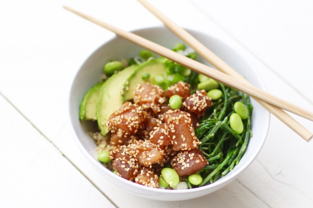 Nee, dit is geen ode aan de Pokémon rage en nee dit gerecht is niet vernoemd naar een Poké ball. Een Poke bowl – je spreekt het uit als poh-keh – is een Hawaiiaanse salade met rauwe vis en rijst, maar de ingrediënten doen eigenlijk meer Oosters aan. Het komt erop neer dat je je favoriete ingrediënten bij elkaar sprokkelt en serveert in een grote kom, oftewel bowl. Het is een lekkere manier van eten omdat je alles door elkaar husselt – met een lekker sausje – en ook nog eens een héle leuke door al die kommetjes op tafel. Een echte diehard eet haar poke met stokjes maar een vork mag natuurlijk ook. Het voordeel van eten met stokjes is dat je langzamer eet en dat is beter voor je spijsvertering.