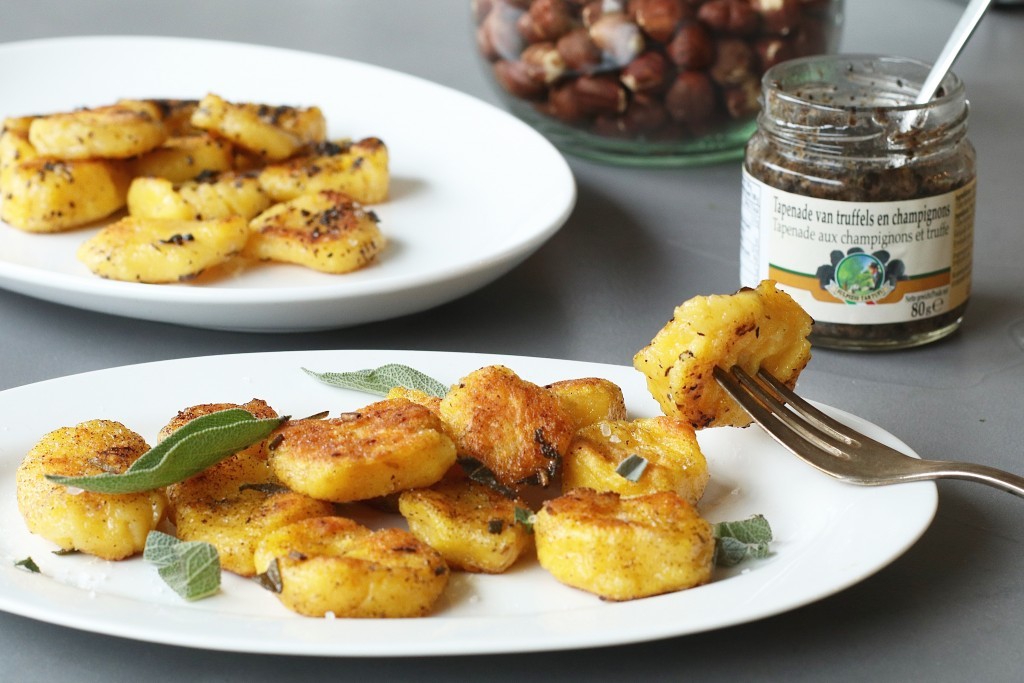 Gnocchi, ik ben er gek op! Je kunt het eten in plaats van pasta, aardappeltjes of rijst. Je maakt het normaliter van aardappelen, meel en ei maar ik maakte er mijn eigen variatie op door pompoen te gebuiken. Het resultaat is heerlijk zoete gnocchi die onwijs lekker smaakt in combinatie met truffel. Truffel is ook zo’n ingrediënt waar ik dól op ben. Mijn lievelings op het moment is de truffeltapenade van de Albert Heijn (zie het potje op de foto) gemaakt van zwarte zomertruffel en Italiaanse paddestoelen. Je kunt het door je pasta heen scheppen (met als resultaat meeega lekkere truffelpasta), maar je kunt het ook mengen met mayo zodat je truffelmayo krijgt. JUM! In de recept breng ik er mijn pompoen gnochhi mee op smaak.