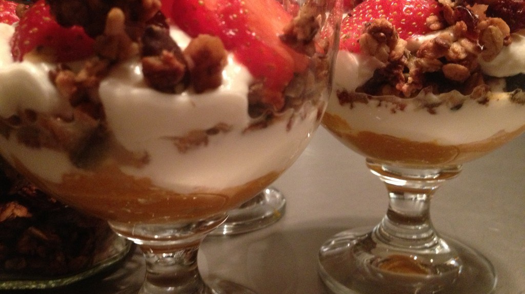 Groente is een toetje, ik ben dol op dat soort gekke, verrassende combinaties! Daarom werd ik helemaal blij van deze "pompoen-yoghurt parfait' met aardbeien en granola. Super eenvoudig te maken en perfect als dessert wat je van te voren kan bereiden. Verwenontbijt op zondag mag natuurlijk ook!