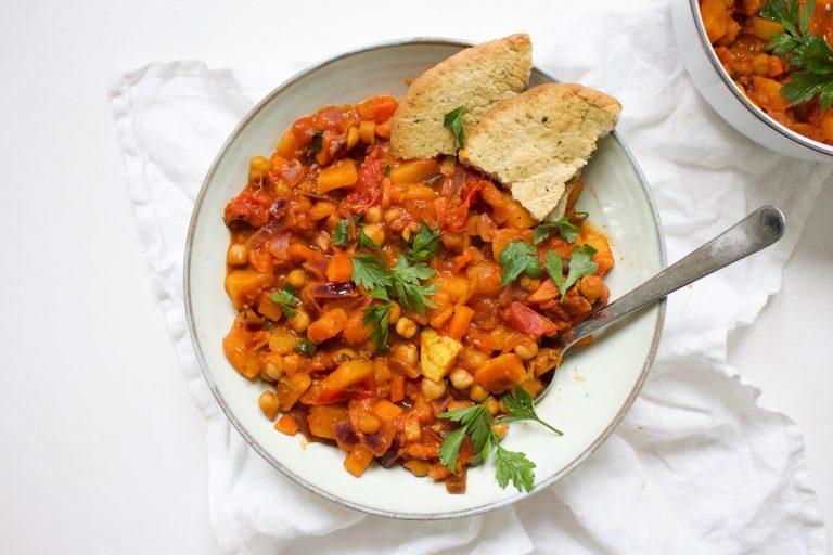 Het gerecht is voedzaam door de groentes en kikkererwten. En kun je geloven dat dit heerlijke gerecht helemaal plantaardig is? Serveer met wat bruine rijst of een stuk naanbrood, zodat je lekker kunt dippen!
