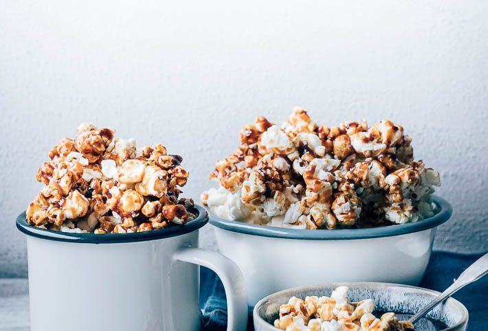 Popcorn, ik vind het heel grappig om te bedenken dat ooit iemand heeft bedacht om maïskorrels te laten poffen. Dat het veranderde in een beetje chewy, luchtige, schuimachtige, maar goed eetbaar snackje. En dacht: dit ga ik vaker doen en ik maak het nog voor anderen ook! Die vervolgens razend enthousiast waren van deze uitvinding. Ik zoek dit soort dingen altijd uit en op, vind ik leuk! Wat blijkt: zo’n 5000-6000 jaar geleden deden ze die mais al laten poppen! Maar er was natuurlijk wel iemand heel briljant om er boter en suiker omheen te verzinnen en het massaal te gaan verkopen in de bioscoop. Nu kun je een bioscoop niet meer voorstellen zonder popcornlucht! Want hoe lekker het ook is, het geeft een beetje een aparte muffige geur aan de ruimte! Maar laat dat je niet weerhouden want deze popcorn met baconmag er zijn hoor! Dus ga maar vast op zoek naar een leuke binge waardige serie op Netflix en maak een flinke hoeveelheid van deze popcorn met bacon!