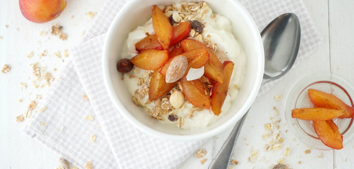 In deze tijd van het jaar zijn er volop pruimen te krijgen en ze zijn zó lekker! De pruimenboom bij mijn ouders is nu wel leeg, maar ook in de winkel liggen nu pruimen in allerlei soorten. Heerlijk om zo uit het vuistje te eten, of om een pruimen plaatcake mee te bakken. Maar je kunt deze vruchten ook in een lekker ontbijtje verwerken. En dan dus niet simpelweg in stukjes snijden en aan je yoghurt toevoegen, nee... Ik maakte deze pruimen klaar in de oven en daardoor geef je net even een speciale touch aan je ontbijt.