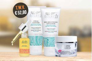 In het pakket zit: Rozenbottelolie littekens & anti-aging, Gezichtsreiniger, Gezichtsscrub en Dag- en nachtcrème.