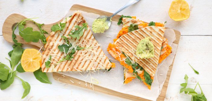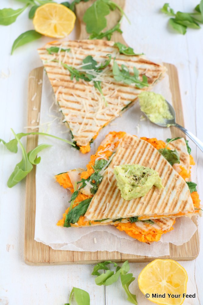 Mijn voornemen na de vakantie was om wat meer tijd te besteden aan mijn lunch. Dat was er tijdens de vakantie namelijk een beetje bij ingeschoten. Ik maakte óf te weinig tijd voor mijn lunch, of ik vergat het gewoon helemaal. Druk bezig met hard werken, of juist met niks doen, vond ik het lunchmoment wel prima, de afgelopen weken. Maar nu ik weer in mijn eigen keuken kan koken, en weer wat meer rust heb, is het tijd om aan mijn goede voornemens te werken. Zo maakte ik deze week een quesadilla met zoete aardappel en rucola, en daar werd ik alvast heel blij van!