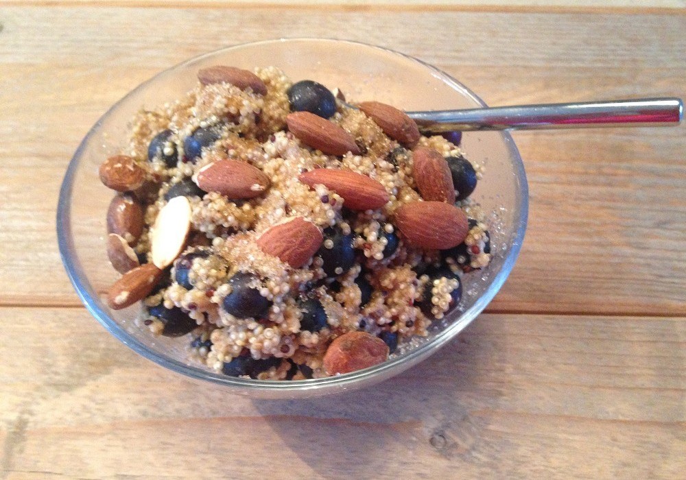 Goede voornemens. Ik heb ze plenty. Eigenlijk altijd wel, maar toch sta ik er zo aan het begin van een nieuw, fris jaar even extra bij stil. Mijn goede voornemens hebben altijd te maken met iets meer rust en meer genieten. Die twee gaan hand in hand want als ik de dingen die ik op een dag doe minder gehaast doe, geniet ik ook meer. En dat begint eigenlijk al bij het ontbijt! Zo ontbijt ik vrijwel iedere dag met yoghurt, fruit en muesli. Terwijl ik eigenlijk iedere dag wat anders wil ontbijten en daar inspiratie genoeg voor heb. Alleen ik neem er geen tijd voor! Daarom start ik in januari weer met goede-voornemen-ontbijtjes. Om te beginnen met mijn favo sportontbijt; warme quinoa met bosbessen.
