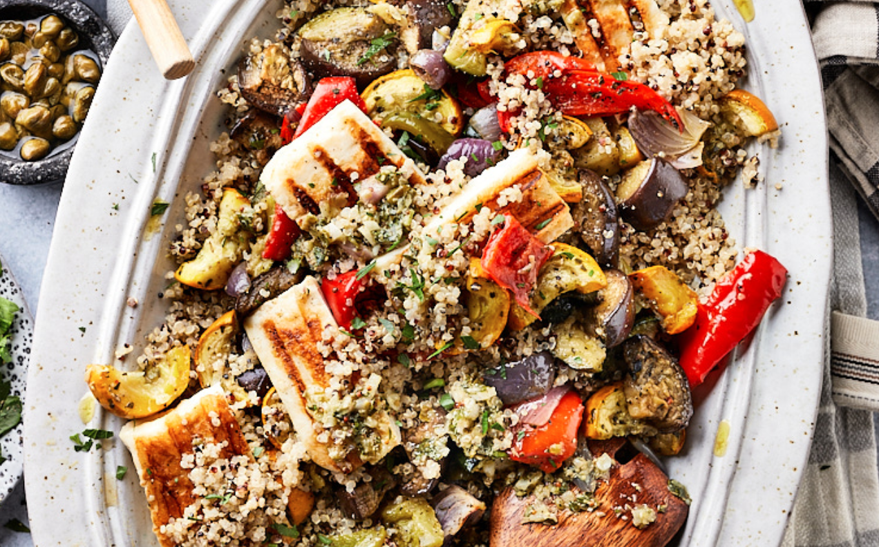 Deze quinoa salade met halloumi is een gerecht dat we hier thuis vaak maken. Het is een maaltijdsalade die goed vult, en door de quinoa en halloumi heb je echt geen vlees of vis nodig. Je hoeft alleen wat groenten te snijden, de oven doet de rest en ondertussen kook je de quinoa, maak je de vinaigrette en grill je de halloumi (een lekker zoutige kaas die je goed kunt bakken). Zo staat er binnen no time een gezonde maaltijd op tafel.
