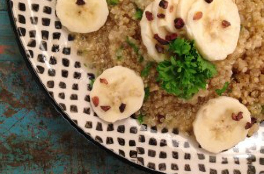 - 45 gram quinoa- 100 ml kokoswater- 1 takje peterselie- 1 banaan- sap van 1 perssinaasappel