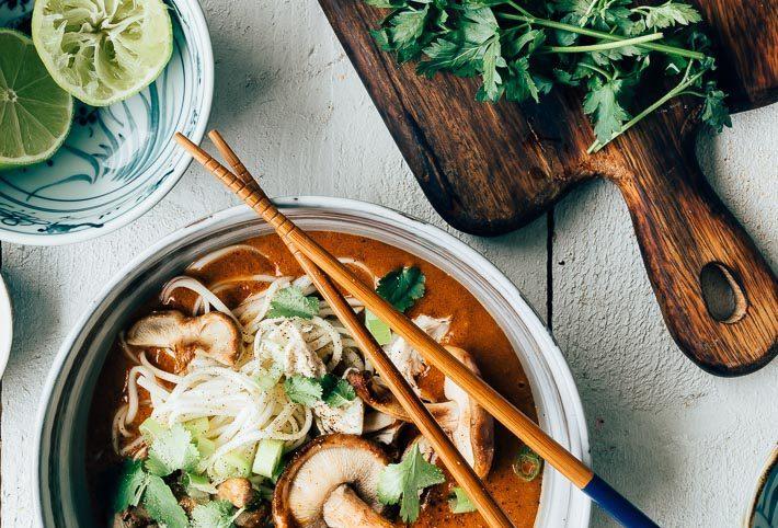 Het is natuurlijk heel leuk om eens een keer zelf je rode curry pasta te maken, maar ook behoorlijk wat werk. En eigenlijk heb je dan nog helemaal niets gekookt, want het echte kookwerk begint pas na het maken van zo’n curry pasta. Daarom gebruik ik vaak gewoon een rode curry pasta uit de winkel, prima om mee te werken en ook een heel stuk sneller. De saus maak je heel snel door de knoflook even in de pan te bakken, curry pasta en pindakaas toe te voegen en de kokosmelk er doorheen te roeren. De kip kook je in water, dat is eens iets anders dan gewoon in de pan bakken. Je kunt wanneer de kip gaar is, hem uit elkaar trekken. Zoals pulled pork. Om de kip wat meer smaak mee te geven kun je hem koken in kippenbouillon.