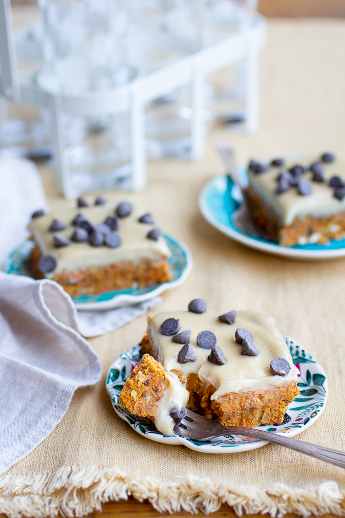 Nou, dat is gelukt. Deze rauwe carrot cake met vanillefrosting is zó lekker. Je maakt ‘m in slechts 15 minuten (!!) en daarna laat je alles opstijven in de koelkast, maar dat duurt nu ook weer niet zo heel erg lang. De chocolate chips bovenop zijn optioneel, maar voegen natuurlijk wel net even dat extraatje toe. Al zouden wat kokosvlokken ook zeker niet misstaan.