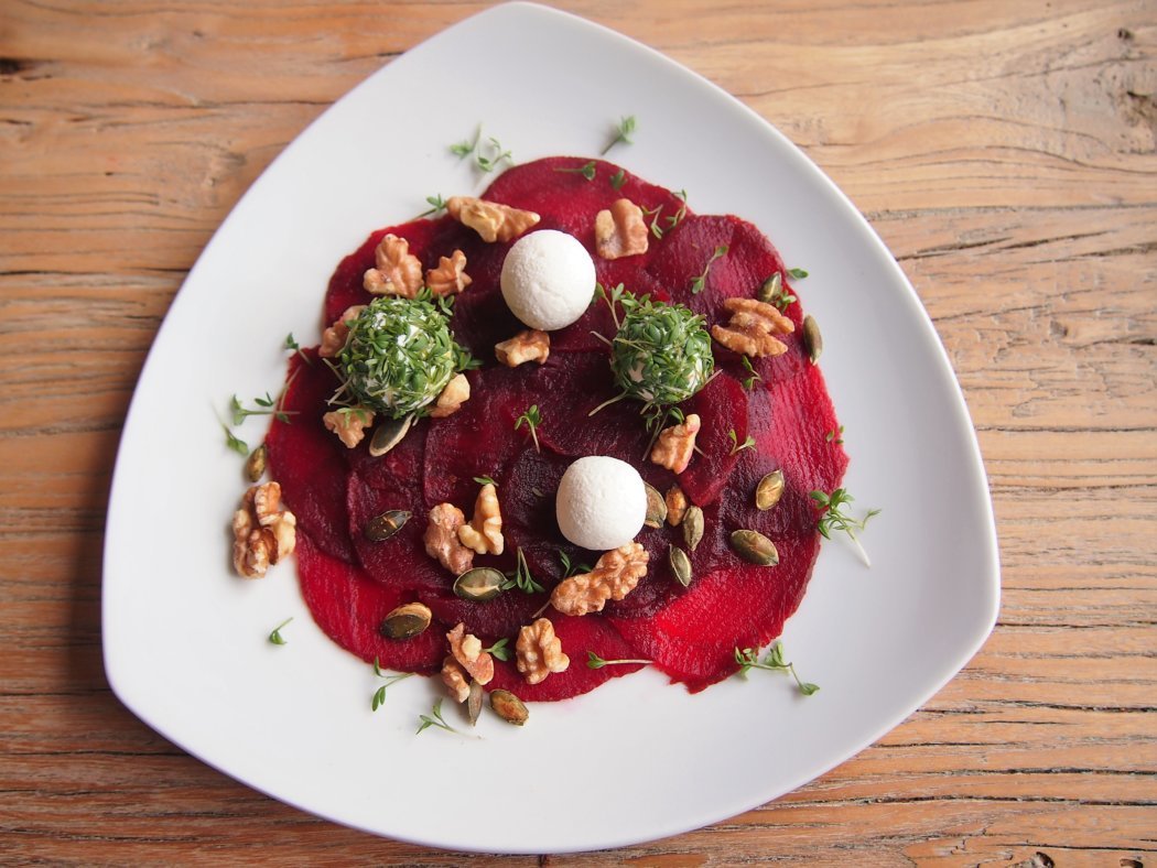 Steel de show met deze bieten carpaccio! Het ziet er niet alleen mooi uit door de geitenkaasballetjes met Cress, het smaakt ook heerlijk. Door de tuinkers krijgt de geitenkaas meer pit en smaak. In combinatie met de zoete bieten en de knapperige nootjes is dit een fantastische combinatie.