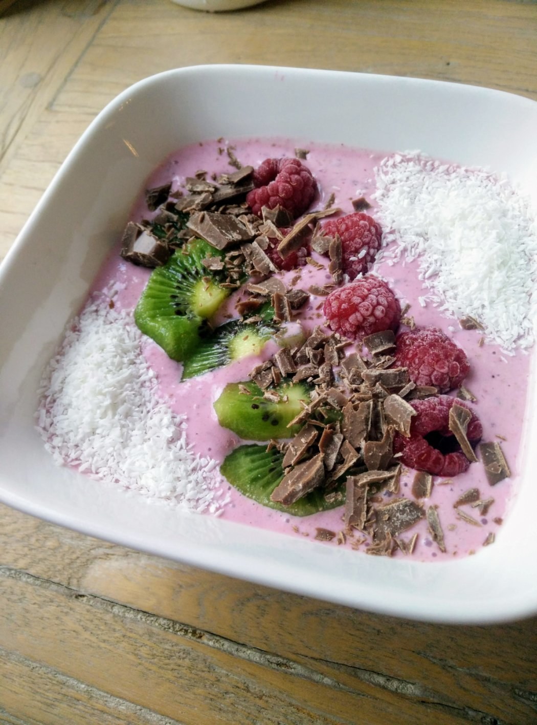 Als topping: 1 kiwi, stuk(je) chocolade, handje kokosrasp en wat frambozen