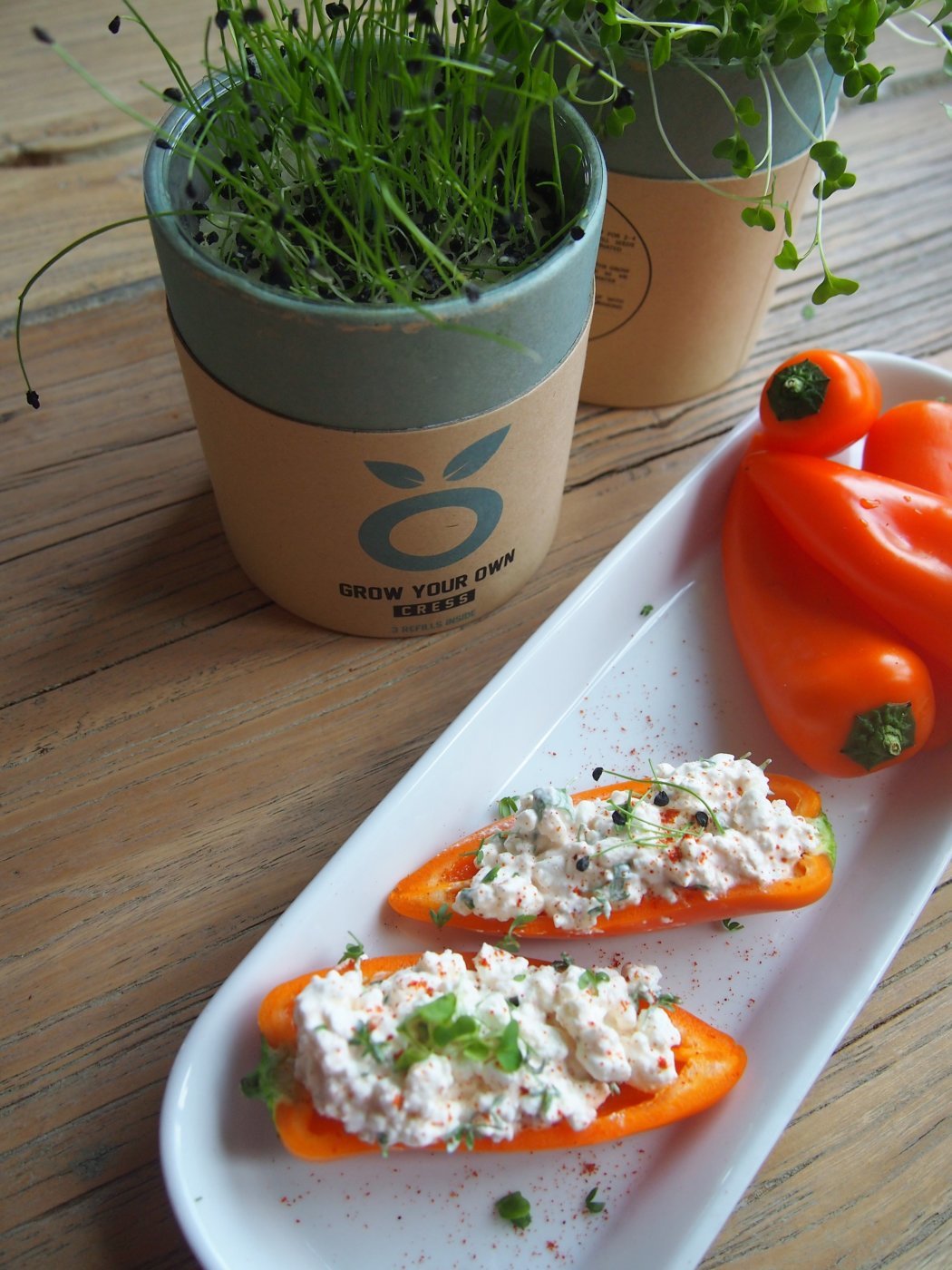 Deze mini paprika’s kun je vullen met verschillende dingen en ze zijn een grote hit bij kinderen! Dit hapje is een combinatie van fris en romig met kruidige Cress. Heerlijk voor straks op de borrelplank als de zon schijnt!