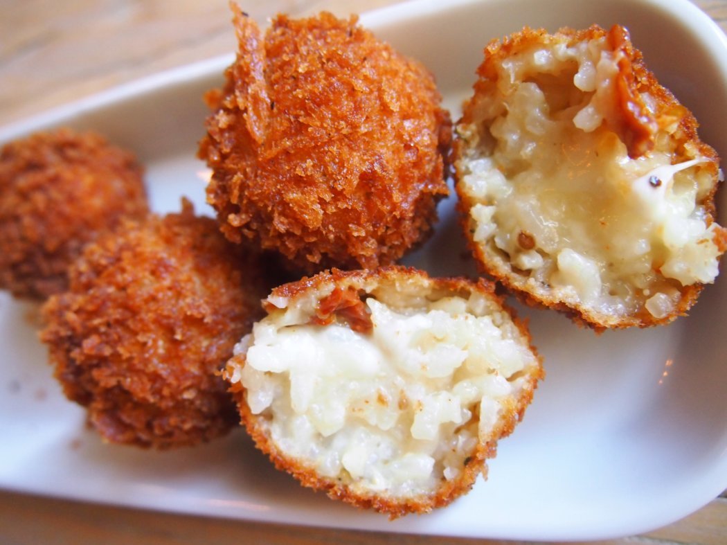 Op zoek naar een lekker voorgerecht of een hapje voor de zondagmiddagborrel? Deze knapperige risotto balletjes gevuld met mozzarella zijn een dikke hit! Het uiterlijk van een bitterbal, gevuld met romige risotto en smeuïge kaas. Ik geef toe, het is wat werk om te maken maar ze zijn het meer dan waard! Als ik dit lekkere hapje maak dan zorg ik er vaak voor dat ik de risotto een dagje van te voren maak, dan is het goed afgekoeld als je er balletjes van wilt maken.