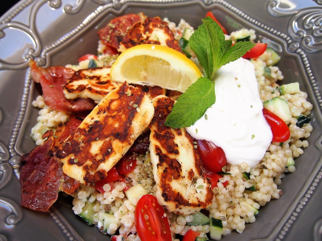 Variatie tip: gebruik feta in plaats van haloumi en laat de rauwe ham weg voor een vegetarische versie. Voeg dan lekker wat olijven toe voor een typisch Griekse salade.