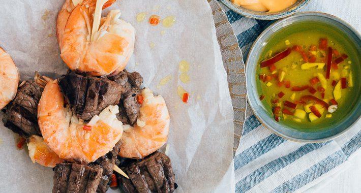 De garnalen geven we nog wat extra pit met een mengsel van chili, knoflook, citroensap en zout. En ook de biefstuk brengen we op smaak met wat knoflook, olijfolie en peper en zout. Waarschijnlijk heb je die ingrediënten gewoon in huis. Hoef je alleen nog maar de garnalen en het vlees te kopen. Nog een tip voor de spiezen. Week deze eerst even in een bak met water. Dit voorkomt dat ze op de bbq verbranden. Wil je nog meer barbecue recepten bekijken? Dat kan! In ons archief staan er tientallen (klik). Lijkt het jou wat, vis en vlees op één spiesje? En wat is jouw favoriete bbq-recept?