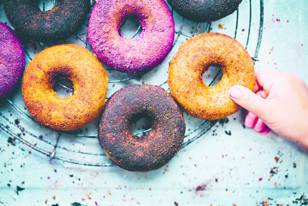 “We zijn niet zo heel erg van de hebbedingetjes en gadgets in de keuken, maar de donutbakvorm met antiaanbaklaag die we een paar jaar geleden in een opwelling kochten, heeft zijn nut inmiddels ruimschoots bewezen. Donuts vallen – dankzij het frituren en die enorme suikerlaag – wat ons betreft in de categorie guilty pleasures. Hoog tijd dus voor een lichtere, minder vette, snellere, maar nog steeds superlekkere luxe versie. Typisch een geval van win/win! Een van de geheimen van deze donut is dat je ’m niet te lang bakt. Laat hem heel even afkoelen, neem een hap en geniet: de donut smelt in je mond. Ze zijn op zichzelf al lekker maar er zijn een aantal toppings die nog meer va-va-voom toevoegen. Soms besprenkelen we ze gewoon met gesmolten pure chocolade en soms bestrooien we ze met kaneelsuiker. Maar mijn favoriet is de zwarte versie, met zoethoutpoeder”, aldus David.