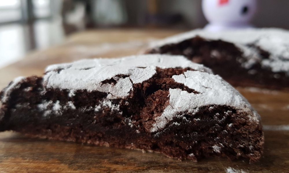 Ik ben gek op koekjes en helemaal op chocolade crinkle koekjes. Knapperig van buiten en lekker fudgy van binnen. Laatst zag ik op het YouTube kanaal van Gemma Stafford (van Bigger Bolder Baking) een recept om 1 grote choco crinkle koek te maken! Ik rende meteen naar mijn keuken om het recept uit te proberen. Tegen de tijd dat vriendlief (eindelijk) uit bed rolde rook de woonkamer heerlijk naar verse koek en chocola. Is er een beter begin van je dag?