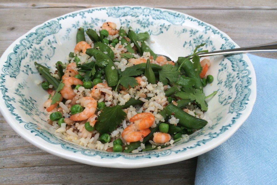 Lekker, gezond én voedzaam is deze spicy rijstsalade met sugar snaps en garnalen. En ook nog eens makkelijk om te maken en snel klaar. Meer zin in een warme hap? Dit gerecht is ook heerlijk als warme maaltijd. Als je niet zo'n fan van garnalen bent kun je het ook met kip maken. En behoor jij tot de groep mensen die koriander naar zeepsop vindt smaken? Ga dan voor verse peterselie of dragon.,