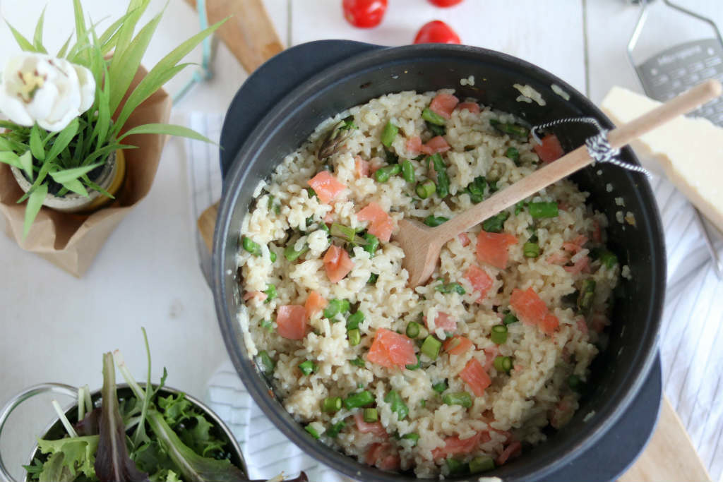 Risotto uit de oven maak ik al jaren in verschillende samenstellingen. Het belangrijkste is eigenlijk dat je arborio risotto rijst hebt. Dit kan ik gewoon kopen bij mijn Plus op loopafstand of bij AH. Voor het eerst combineerde ik groene aspergetips en gerookte zalm in de pan. Ik heb nog net mijn bord niet opgegeten, zo lekker vond ik.