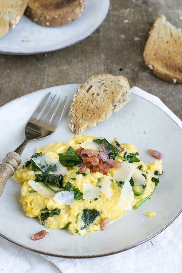 Verwarm een klein beetje olijfolie in de koekenpan en bak de spinazie hier in aan. Bak in een andere droge koekenpan de spekjes krokant.