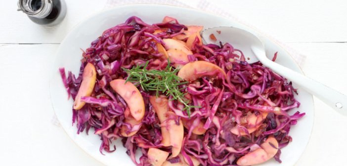 Rode kool met appelmoes. Toen ik klein was, was dat mijn absolute favoriet. Natuurlijk, patatjes en pannenkoeken gingen er ook prima in, maar rode kool... En dan helemaal zoals mijn moeder die kon klaarmaken. Ik at vaak zo snel mijn bord leeg dat ik halverwege al buikpijn had. En toch at ik verder, want ik vond het zó lekker. Best een uitdaging om die heerlijke rode kool van mijn moeder te evenaren, en daar heb ik me dan ook niet aan gewaagd. Ik heb het gewoon helemaal anders gedaan, en deze roergebakken rode kool met appel is wat mij betreft goed geslaagd!