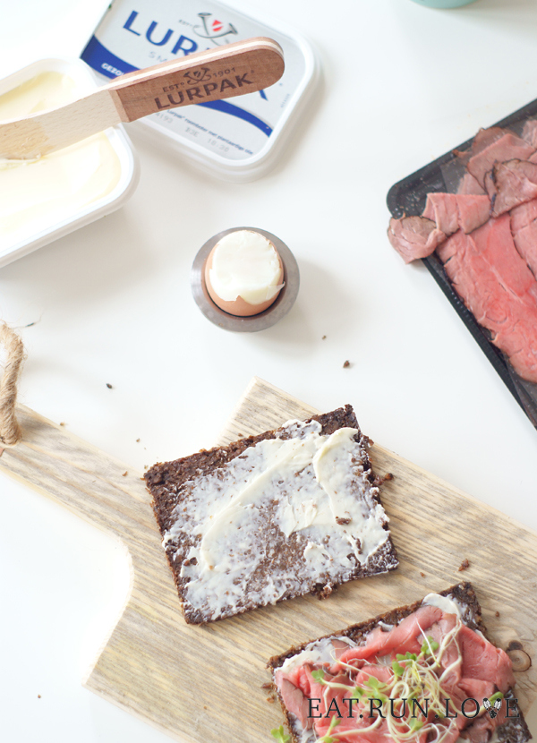 Ik eet roggebrood graag met een laag Lurpak Smeerbaar gezouten - lekker fris en stevig van smaak - en een paar plakjes rosbief (eiwitten!). Wist je trouwens dat belegd roggebrood in Denemarken Smørrebrød wordt genoemd?