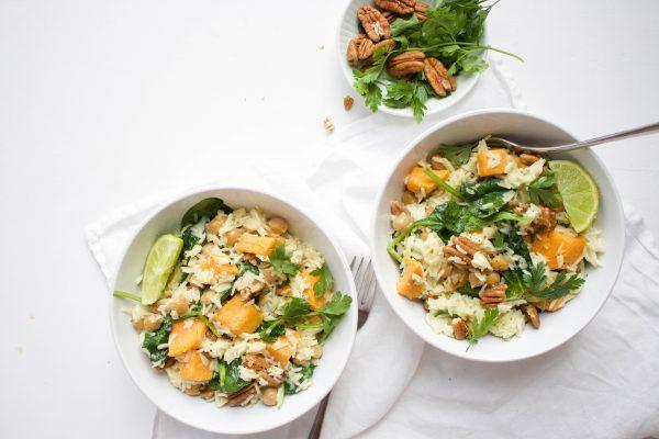 Kokosrijst; rijst bereiden in kokosmelk en bouillon. Hier had ik wel eens van gehoord en was benieuwd hoe dat zou smaken. Ik bedacht een recept met kokosrijst en ingrediƫnten waarvan ik dacht dat deze er goed bij zouden passen; zoete aardappel, spinazie, kikkererwten en noten.