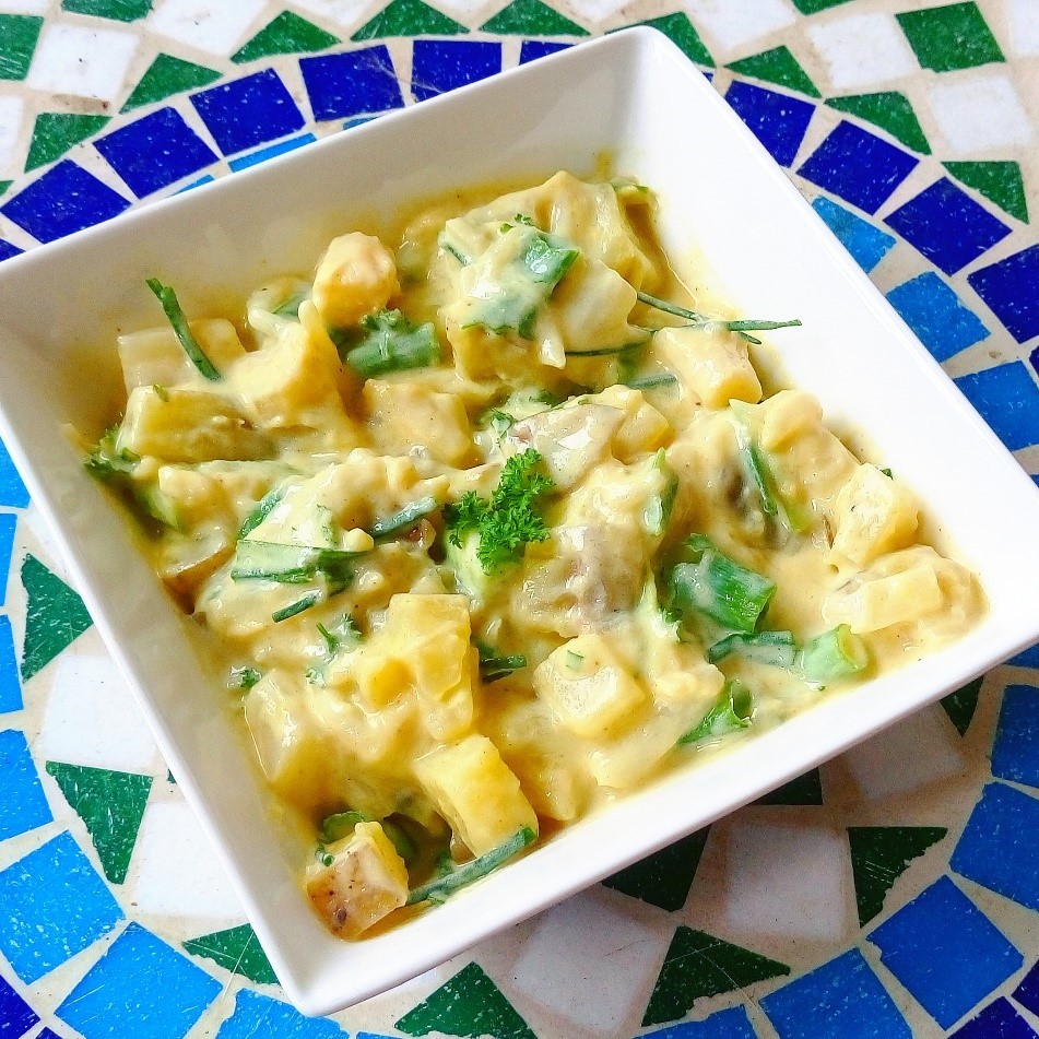 Op zoek naar een heerlijk fris vullend bijgerecht voor een barbecue? Alsjeblieft! Romige aardappelsalade, maar dan gezond 🙂