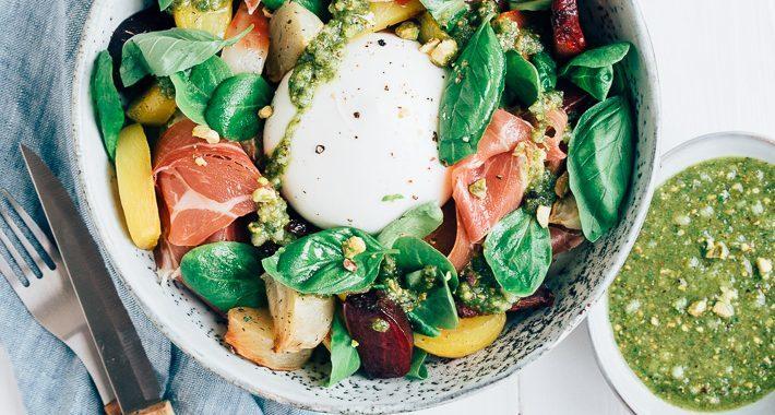 Met een handvol lekkere ingrediënten heb je verder niet zoveel nodig. Dat geldt voor deze salade zeker. Lekkere bieten, smeuïge burrata (of een lekkere mozzarella kan ook) en zachte prosciutto. Afgemaakt met een flinke lepel homemade pistachepesto en klaar ben je. Je kan er uiteraard nog knapperig brood bij serveren of wat geroosterde aardappeltjes. Maar in de zomer heb ik zelf genoeg aan een lichte salade. Ik ben benieuwd wat je ervan vindt. PS sta je op de camping en wil je dit recept maken? rooster de bietjes dan op de barbecue. Echt lekker is dat!