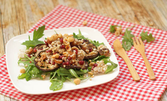 Op Instagram plaatste ik een paar weken geleden een foto van auberginerolletjes die ik had gemaakt voor een barbecue van een vriendinnetje. Deze vielen zo goed in de smaak dat ik dacht daar moet ik wat mee. Omdat ik later die week ook weer zin had in een gerechtje met deze ingrediƫnten, besloot ik er een goed vullende salade van te maken. Een groot succes!
