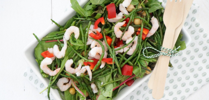 Yes, summer is on! En daar ben ik heel blij mee! Ik ga ongetwijfeld in de komende dagen nog wel eens zuchten dat ik het erg warm heb, maar ik ben zó happy dat het eindelijk zomer is. Ik leef echt op als het warm is, en ik ben ook veel vrolijker en meer ontspannen. De zomer is echt mijn seizoen, en ik hou ervan om lekker veel buiten te zijn. Qua eten vind ik het dan altijd wel wat lastiger, want in warm eten heb ik vaak geen trek. Dus meestal maak ik dan een snelle salade, ook voor de lunch en dat is prima voor mij. Vandaag het recept voor een salade met garnalen en zeekraal.