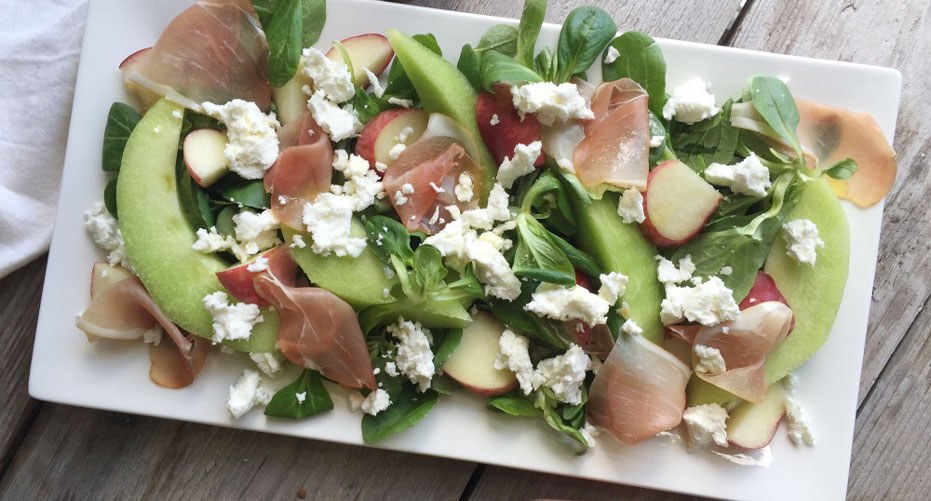 Tijdens zonnige dagen niets liever dan een verse, frisse en kleurige salade. Deze zonnige salade met geitenkaas, meloen en wilde perzik is een toppertje! Helemaal met een paar extra plakken Serrano of Parmaham.