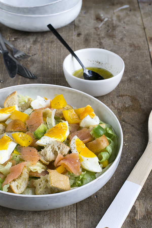 Snijd het brood in stukjes en meng dit met een eetlepel olijfolie, breng op smaak met een beetje zout en peper. Verdeel de stukjes brood over de bakplaat en rooster dit in 10 minuten krokant.