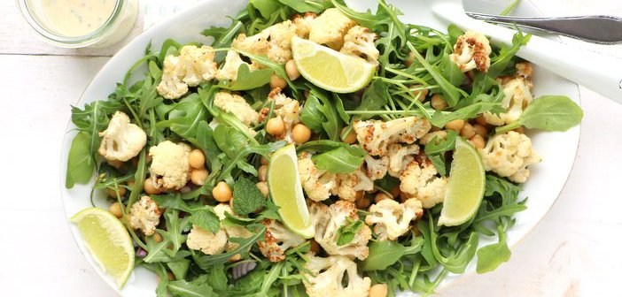 Vanaf nu alleen nog maar lichte gerechten op de blog, want de lente is begonnen! Wat een heerlijk weer afgelopen weekend, je voelt gewoon dat de zon er al helemaal zin in heeft. Nou, van mij mag ie hoor, kom maar door! Ik heb helemaal zin in dit seizoen, in de eerste keren buiten eten, in frisse salades, I'm in! Deze salade met geroosterde bloemkool is wat mij betreft ook zo'n typisch lente gerecht, lekker licht, maar wel met een bite!