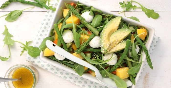Oh, oeps, ik riep al weken geleden dat wat mij betreft het salade-seizoen was geopend, maar volgens mij zijn er nog niet veel recepten voor salades online gekomen. Maar dat ga ik vandaag goed maken, want deze salade met groene asperges en mango heb ik de afgelopen week al 2 keer gegeten en dit is wat mij betreft een blijvertje! Deze salade at ik als lunch, maar ook als bijgerecht bij een makkelijke weekendmaaltijd. Maar ik kan me zomaar voorstellen dat ie ook nog weer op tafel komt als we binnenkort de bbq aansteken. Yes, salad season is on!
