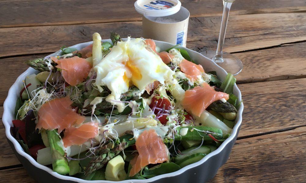 Soms komen dingen in het leven letterlijk aanwaaien. In mijn geval zijn dat vaak de lekkerste nieuwe producten, of letterlijk ingrediënten om mee te koken. Vorig week werd ik verrast met een boeketje; geen bloemen, maar asperges! Toen Ianna gezellig kwam eten en we niet te lang in de keuken wilden staan, werd het recept voor deze salade geboren.
