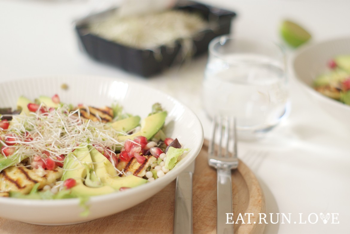 Kennen jullie Halloumi? Ik had het zelf wel eens in een restaurant gegeten, maar nog nooit zelf mee gekookt. Halloumi is een traditionele, ongerijpte Cypriotische geitenkaas en lijkt een beetje op een kruising tussen feta en mozzarella. Zonder er iets mee te doen is het niet zo heel erg spannend, een beetje rubberachtig vind ik het dan, maar zodra je het verwarmd krijgt het een lekkere structuur. Het is ideaal om te marineren, maar ook door de kaas te grillen komt er een lekkere smaak aan. Ik grilde de halloumi en maakte er een salade met halloumi en avocado van.