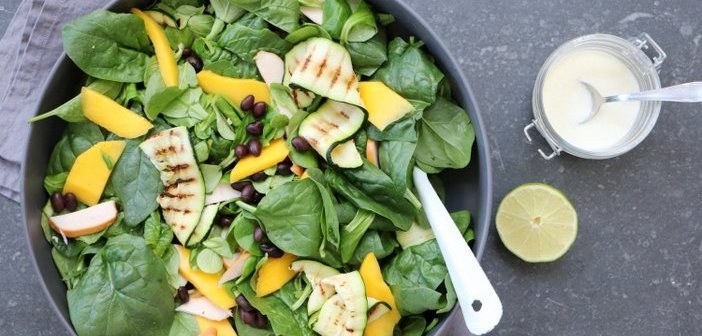 Hallelujah, wat word ik vrolijk van dit weer! Van mij mogen we zo in 1 keer door naar de zomer toe! Lekker veel buiten zijn, genieten van de zon, volgens mij is iedereen ook een stuk blijer op dit soort dagen. Heerlijk! De meiden hebben meivakantie dus we trekken er lekker veel op uit. Naar het strand, naar de stad, naar de zwemplas. En in de avond eten we buiten! We hebben de afgelopen dagen vaak de bbq aan gehad. Een stukje vis of vlees erop, en dan een broodje erbij. En een salade natuurlijk, zoals deze salade met kip, gegrilde courgette en mango. Zonnig genieten!