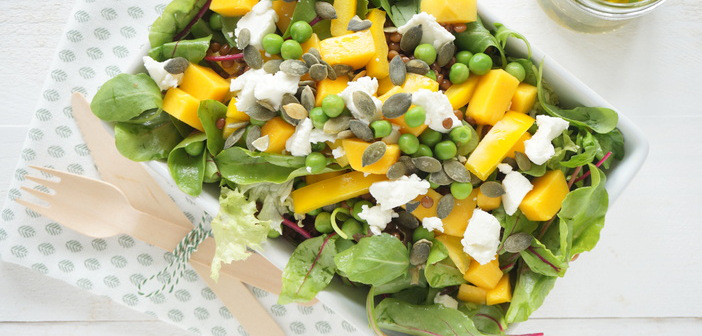 Sinds ik aankondigde dat het saladeseizoen geopend was, hebben we eigenlijk nog maar weinig echte salade-dagen gehad. Maar omdat ik er niet van hou om te klagen over het weer, tover ik gewoon zelf de zomer op tafel. Je kunt dat zomergevoel tenslotte best een beetje afdwingen. Ik tover echt bijna dagelijks een nieuwe salade op mijn bord en meestal bestaat die salade uit de restjes uit mijn koelkast en uit wat ik nog in mijn voorraadkast heb staan. Ik gooi de hele boel bij elkaar en tadaa, een salade. Die ik dan vervolgens opeet en dan pas bedenk ik me dat ik wel even foto's voor de blog had kunnen maken. Gelukkig had ik deze keer wel genoeg tijd om de salade met mango en geitenkaas op de foto te zetten...!