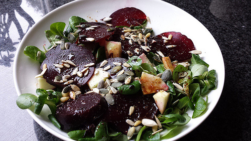 1 gekookte rode biet | veldsla | 1/2 appel | een handjevol zaden en pitten (gemixt te koop bij de supermarkt) | peper & zout | olijfolie | balsamico azijn | mierikswortel (de smeerbare variant, uit een potje) | honing