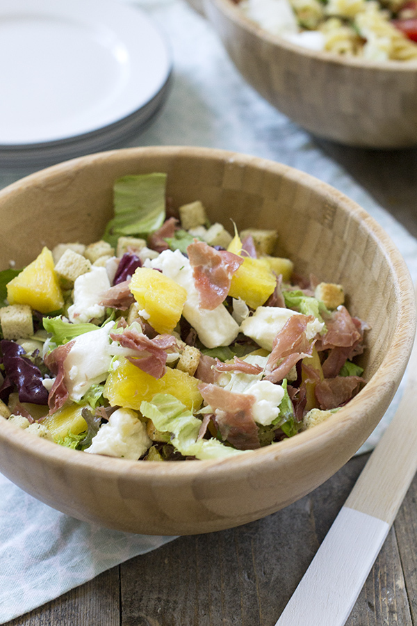 Na deze barbecue heb ik de salade een aantal keer gemaakt, hij blijft lekker. De gegrilde ananas en serranoham zijn een super lekkere en verrassende toevoeging aan de salade. De romige mozzarella en krokante croutons erbij maken het af.