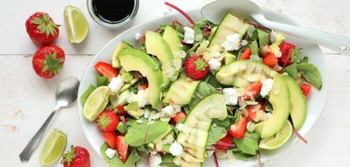 Ik heb een plan bedacht, en jullie moeten allemaal met mij mee doen. Moet ja, het is verplicht... Ok, grapje natuurlijk, maar als we nou eens met z'n allen heel hard aan de zomer gaan denken, en vooral veel frisse en kleurrijke salades op tafel zetten, dan zal het toch echt wel lukken? Ik ben echt niet zo van het zeuren over het weer, maar het is de afgelopen dagen ongeveer net zo grijs als in de herfst. Ik bedoel, het hoeft echt geen 30 graden te zijn, maar kan iemand het licht aanzetten?... Ik zal zelf het goede voorbeeld geven door deze salade van snijbiet met aardbei en avocado met je te delen. Lijkt me heerlijk op een zomerse dag, de bbq aan en lekker buiten eten. Come on, moet goed komen toch?